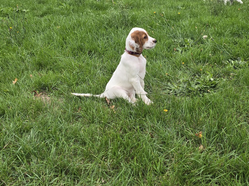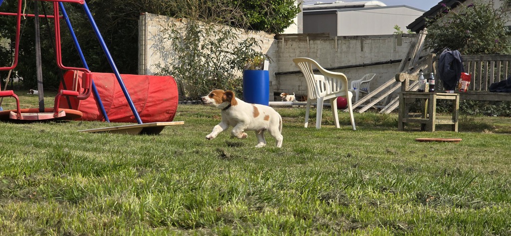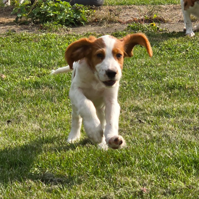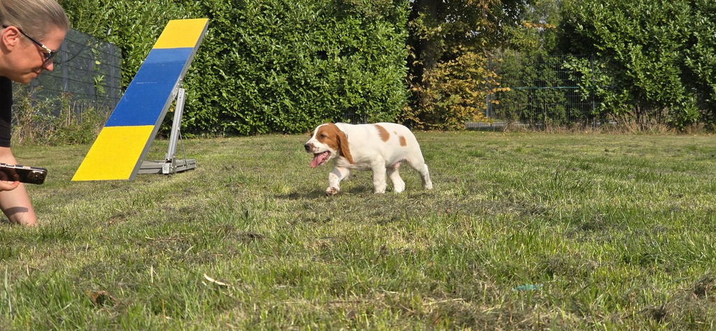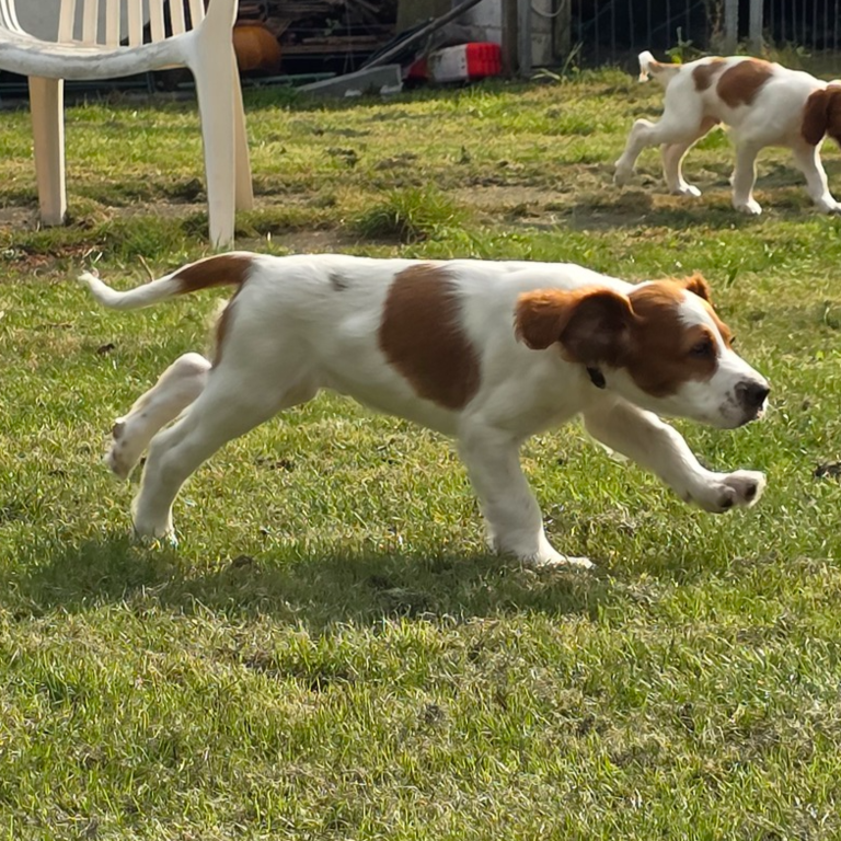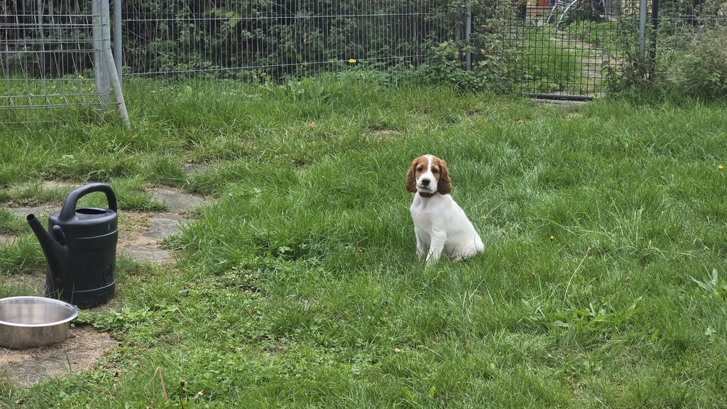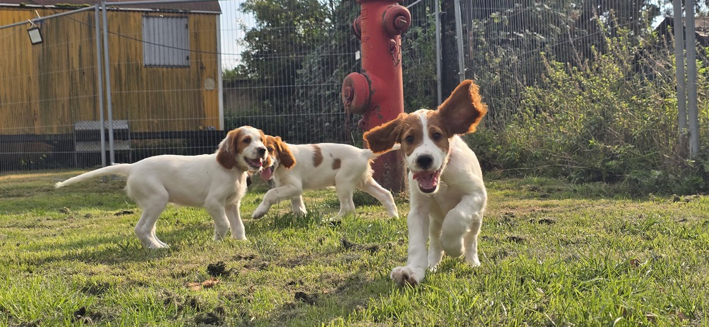Ébhinn (oranges Halsband) liebt es zu rennen und zu toben. Sie sucht aktive Menschen, mit denen sie viele Abenteuer erleben kann.