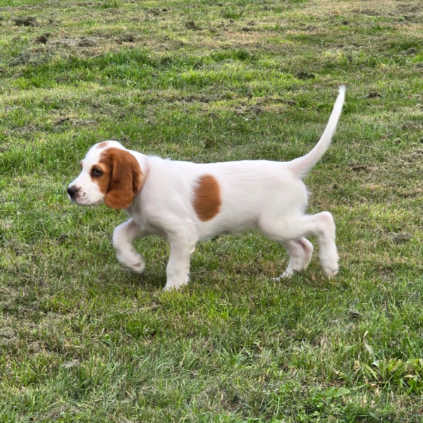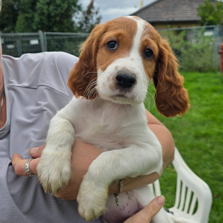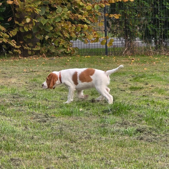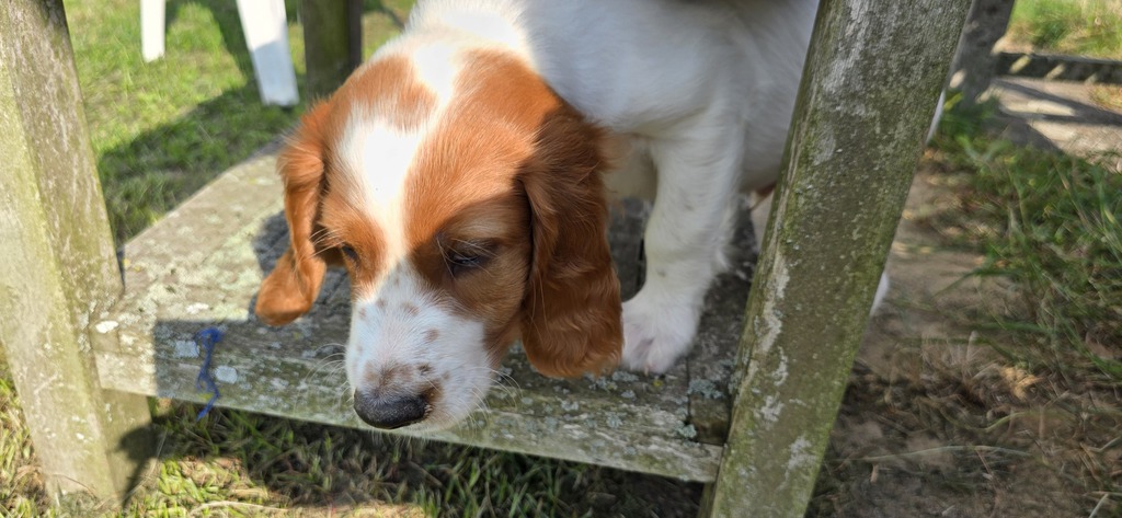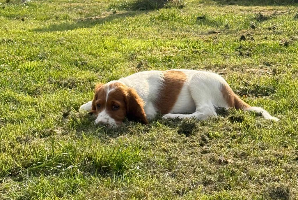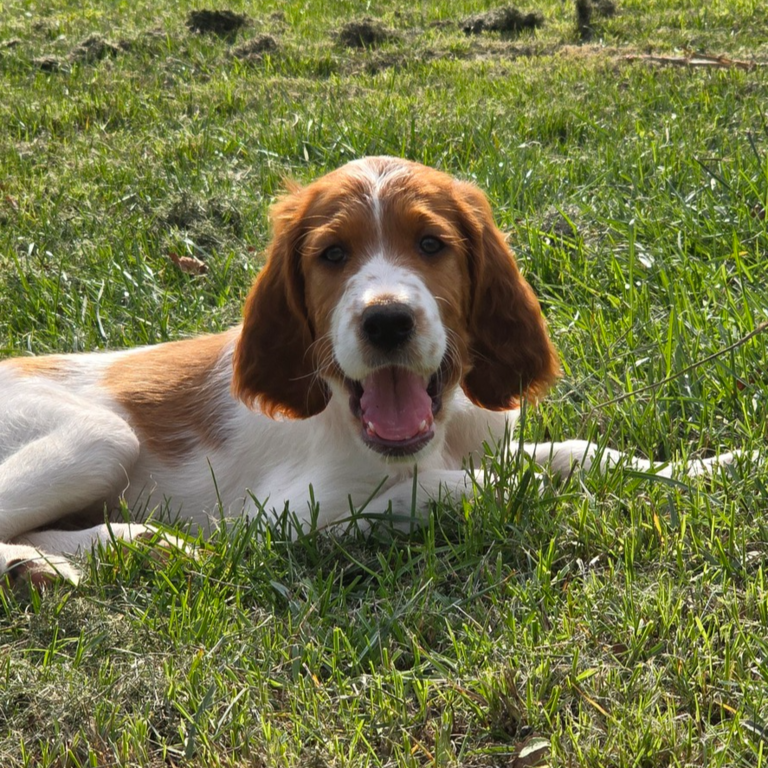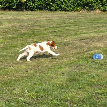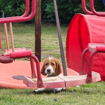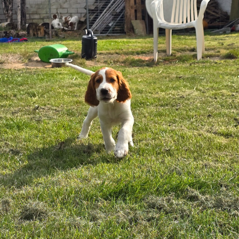 Ébhinn (oranges Halsband) liebt es zu rennen und zu toben. Sie sucht aktive Menschen, mit denen sie viele Abenteuer erleben kann.